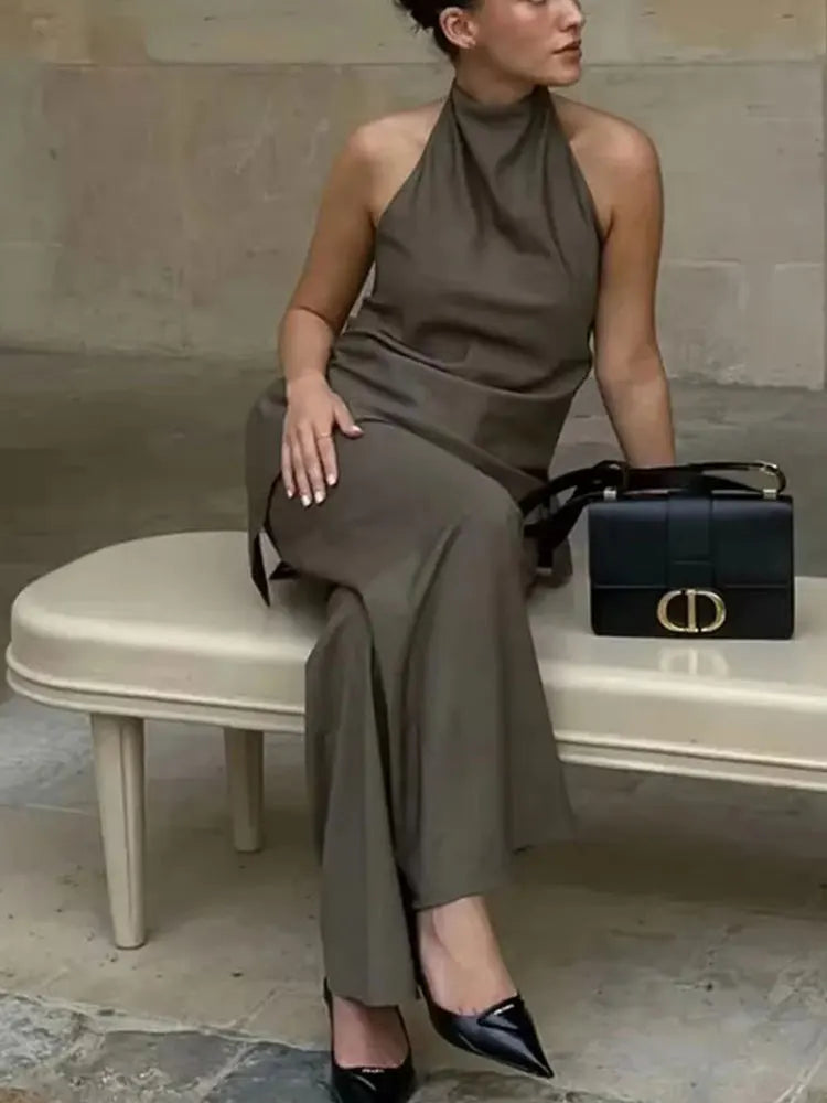 Elevate your style with this elegant women's set, consisting of an asymmetrical halter top and flowing wide-leg pants, perfect for those seeking a modern, sophisticated, and comfortable look.