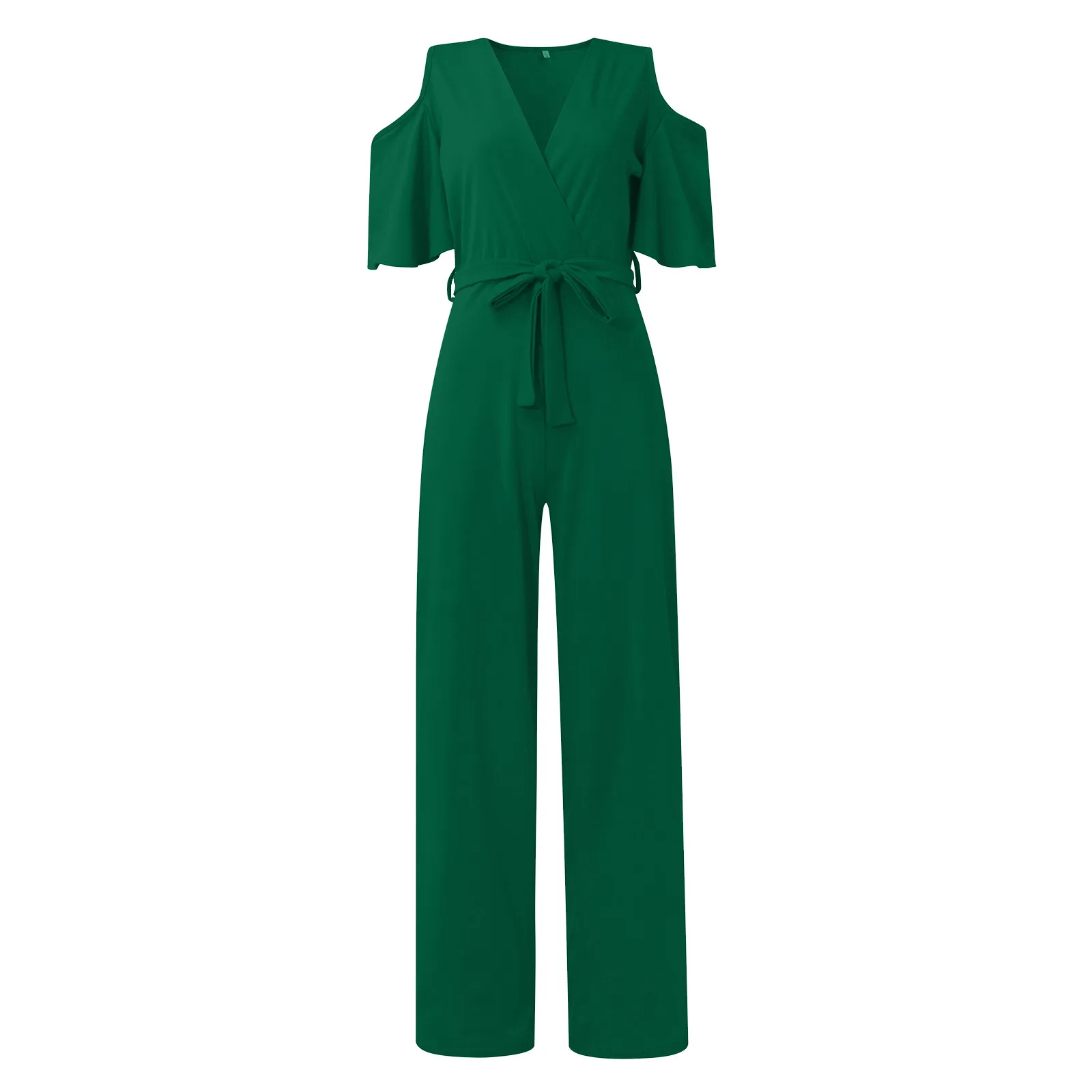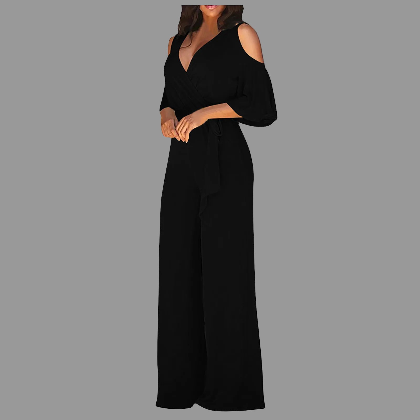 Elevate your style with this elegant women's jumpsuit, perfect for those seeking a modern, comfortable, and sophisticated look. Featuring a cutout shoulder design, loose 3/4 sleeves, and a crossover neckline, it flatters the silhouette without sacrificing comfort. The wide leg elongates the body and adds movement to the look, ideal for various occasions—from formal events to everyday wear.